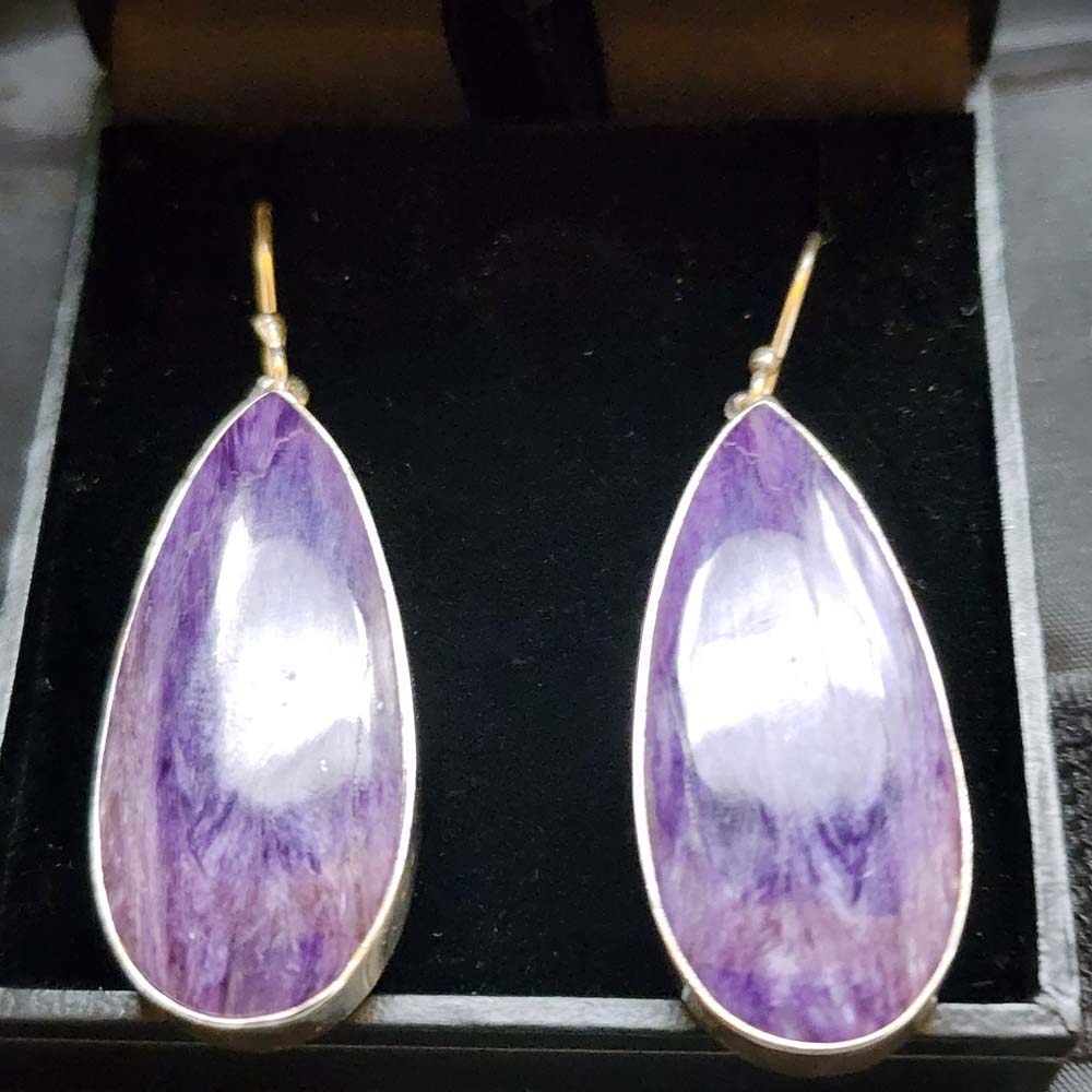 LARGE CHAROITE DROP EARRINGS WITH FRENCH EAR WIRES IN 0.925 STERLING SILVER