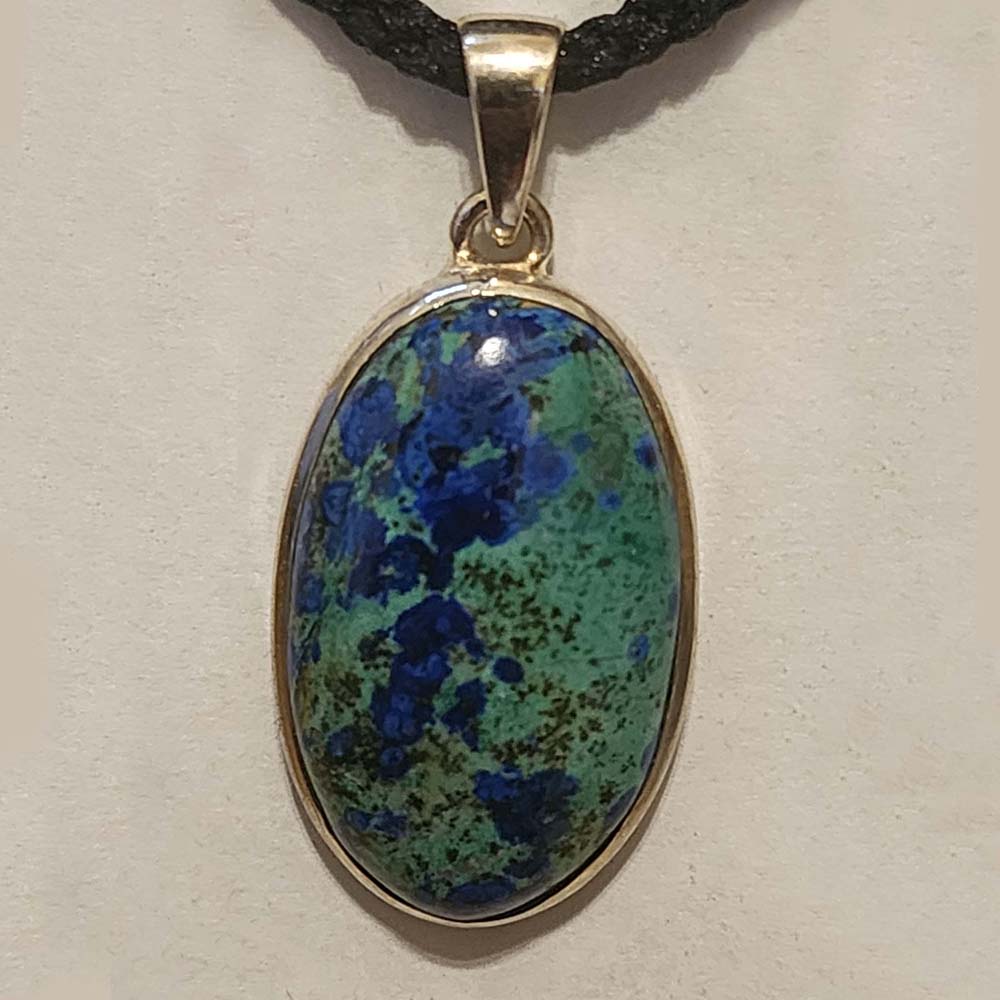 Chrysocolla is a microcrystalline copper mineral frequently found with Azurite, Turquoise, or Malachite. Valued by native Americans for its lovely mix of blue and green colors, the stone is frequently incorporated into “Southwestern style” jewelry. Metaphysically, chrysocolla is believed to soothe, calm, and inspire. Here we have a lovely, medium-sized pendant displaying the stone in its singular beauty